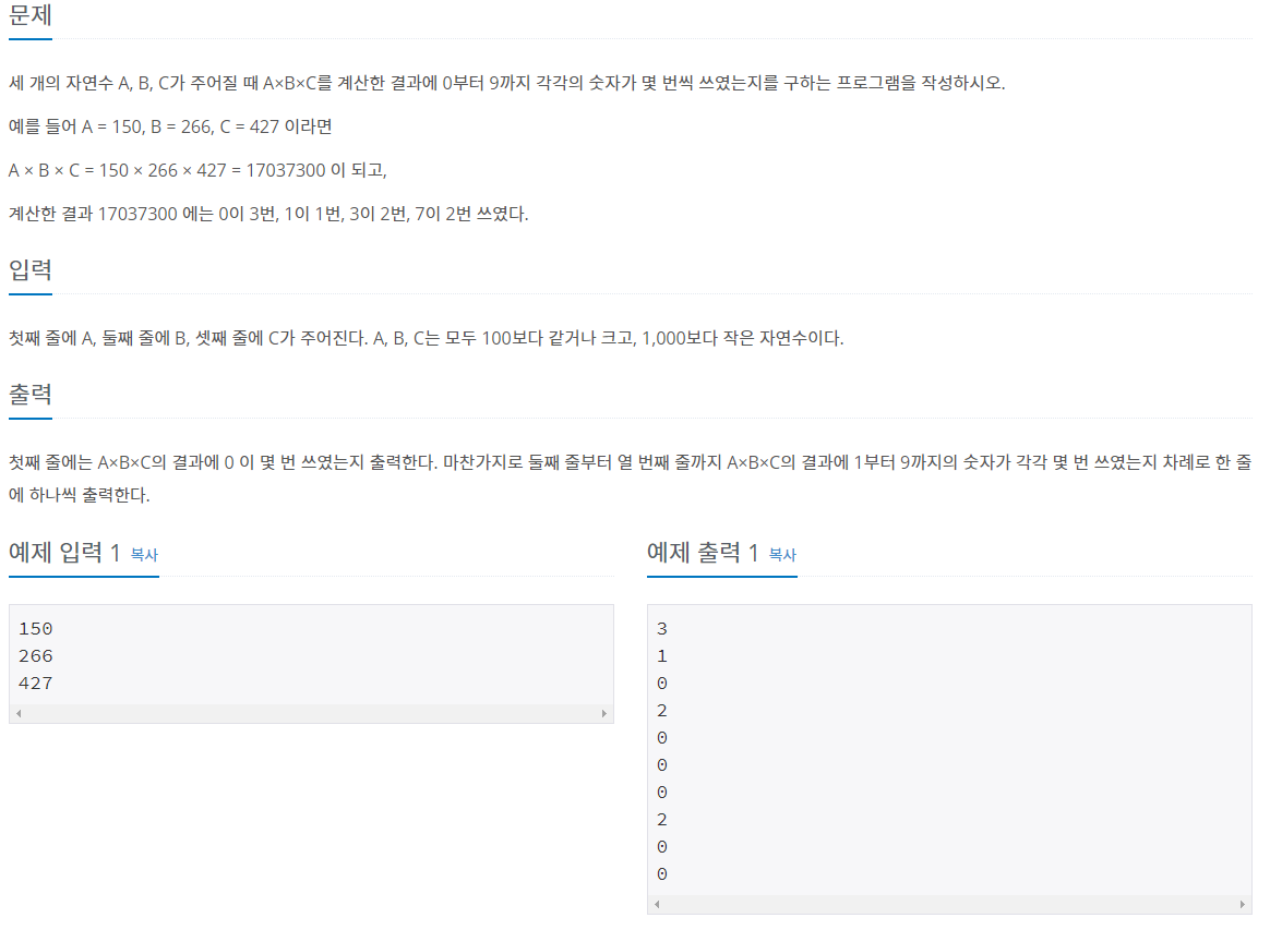 백준 알고리즘의 1차원 배열 숫자의 개수 ( 문제 번호 : 2577 )의 소스입니다.