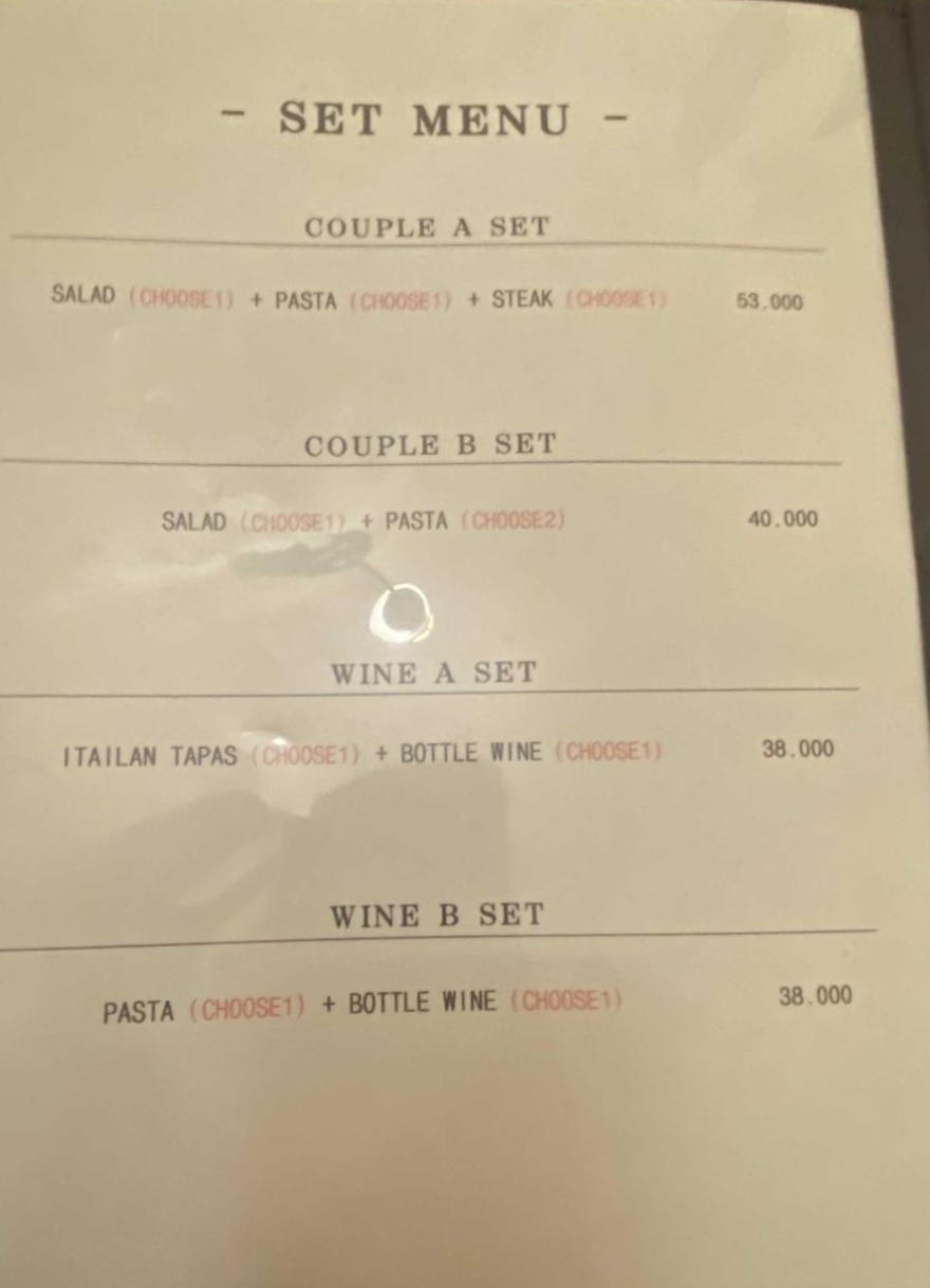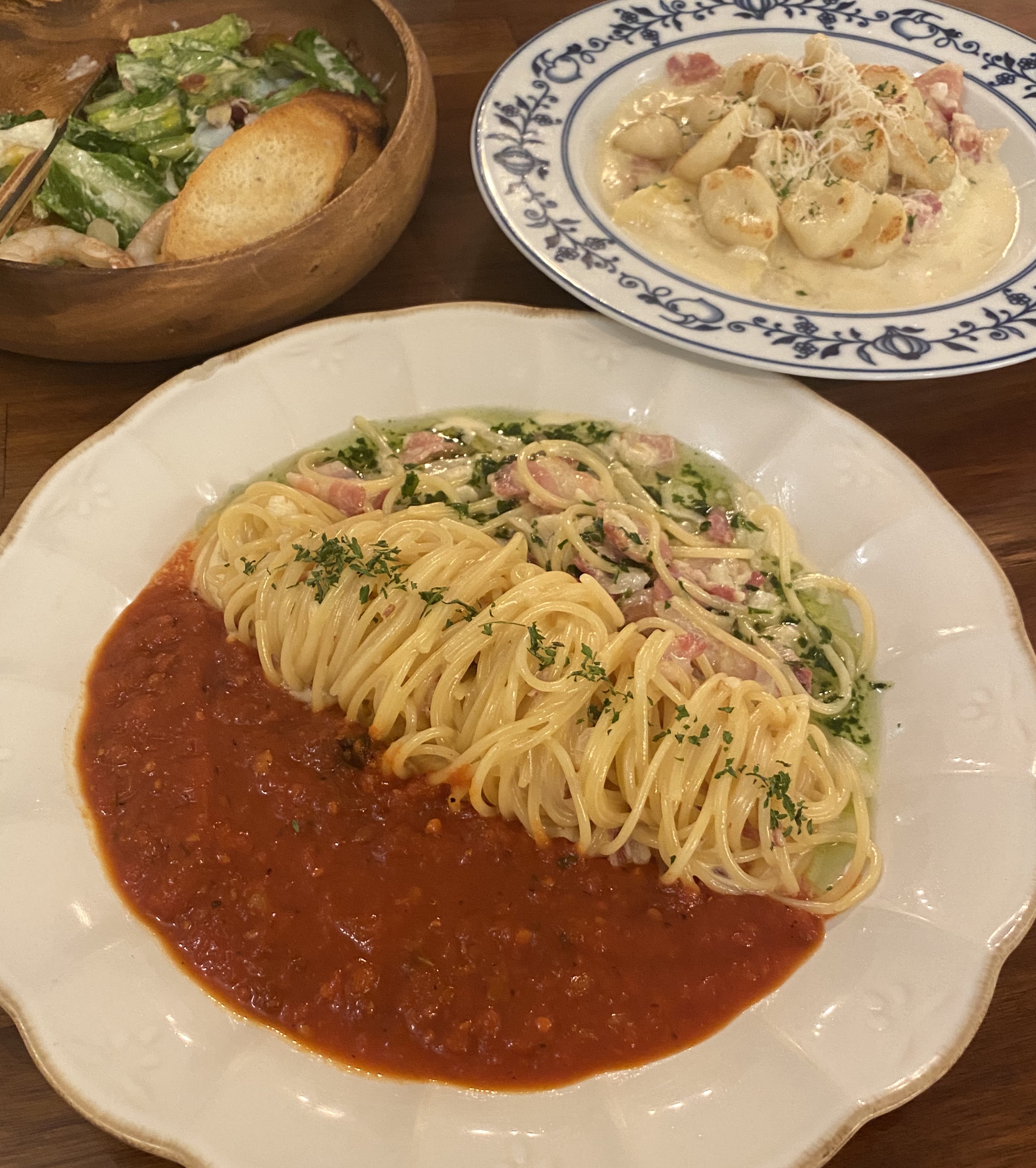 저는 커플 B SET에 3색 파스타와 감자 베이컨 크림 뇨끼와 시저샐러드를 주문해서 먹었습니다.