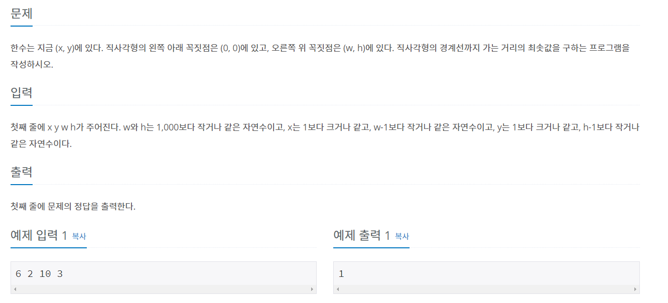 백준 알고리즘의 수학2 중 직사각형에서 탈출 ( 문제 번호 : 1085 )의 소스입니다.
