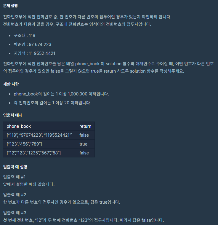 오늘의 코딩테스트 문제는 해시 중 전화번호 목록에 대한 문제 풀이 입니다.
