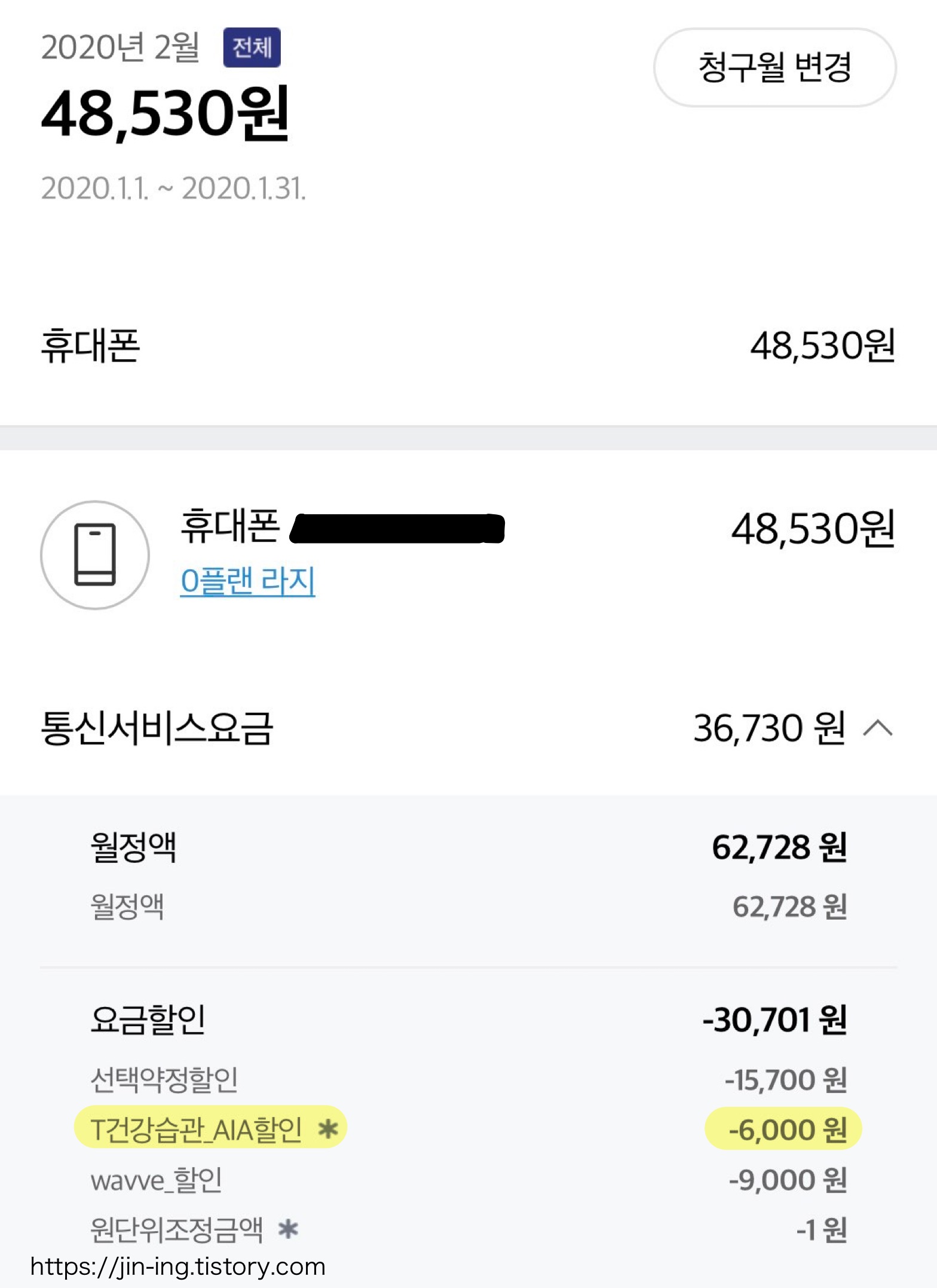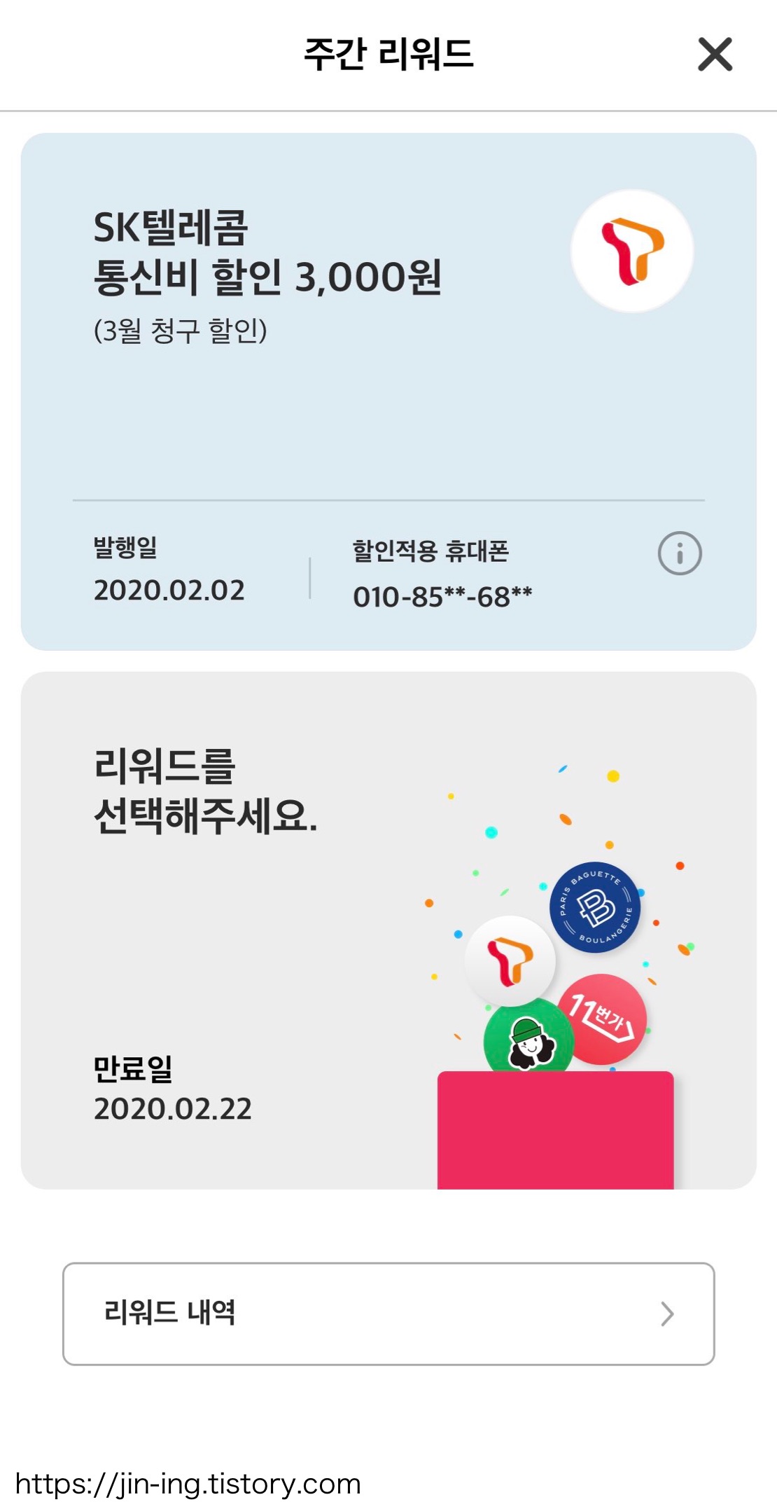 리워드를 고르고 나면 다음달 통신비에 할인 된 것을 확인 할 수 있습니다.