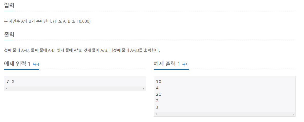 입출력과 사칙연산 중 사칙연산( 문제 번호 : 10869 )의 제 소스를 들고 왔습니다.