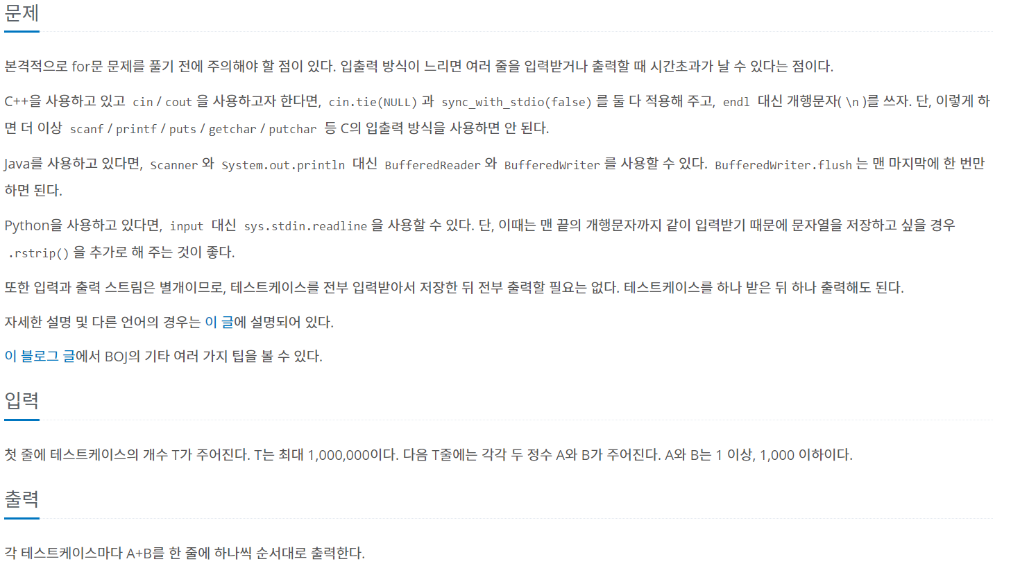 백준 알고리즘의 for문 빠른 A+B ( 문제 번호 : 15552 )의 소스입니다.