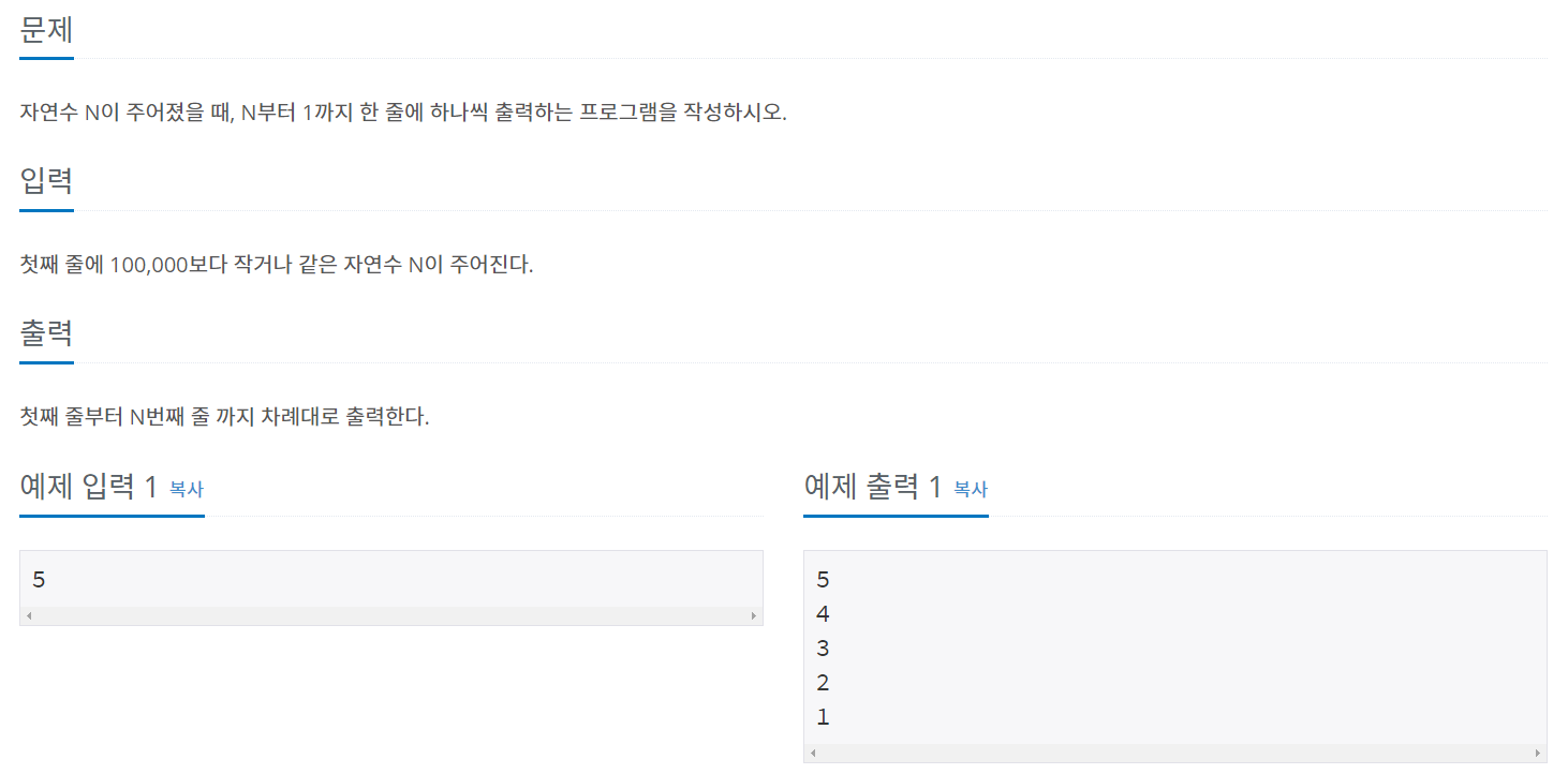 백준 알고리즘의 for문 기찍 N ( 문제 번호 : 2742 )의 소스입니다.