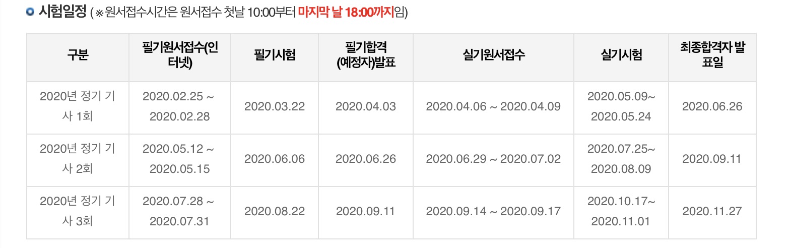 | 2020년 정보처리기사 시험 일정 및 접수 기간 (0) | 2020.02.12 |