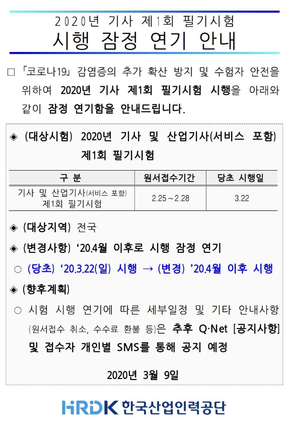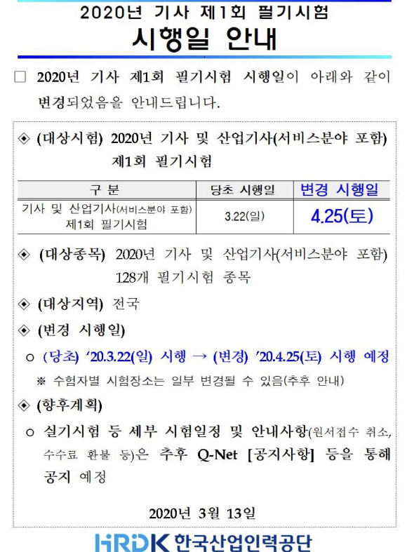 | [ 정보처리기사 ] 1회 필기시험 연기 안내 및 필기 시행일 (0) | 2020.03.10 |