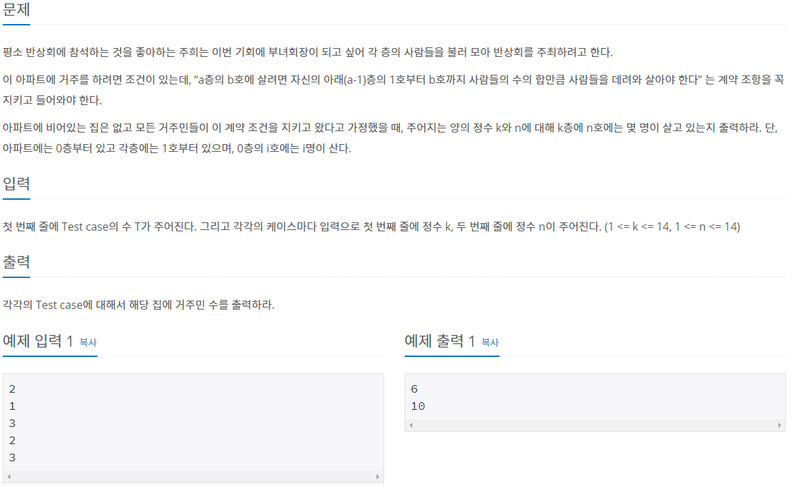 백준 알고리즘의 수학1 중 부녀회장이 될테야 ( 문제 번호 : 2775 )의 소스입니다.