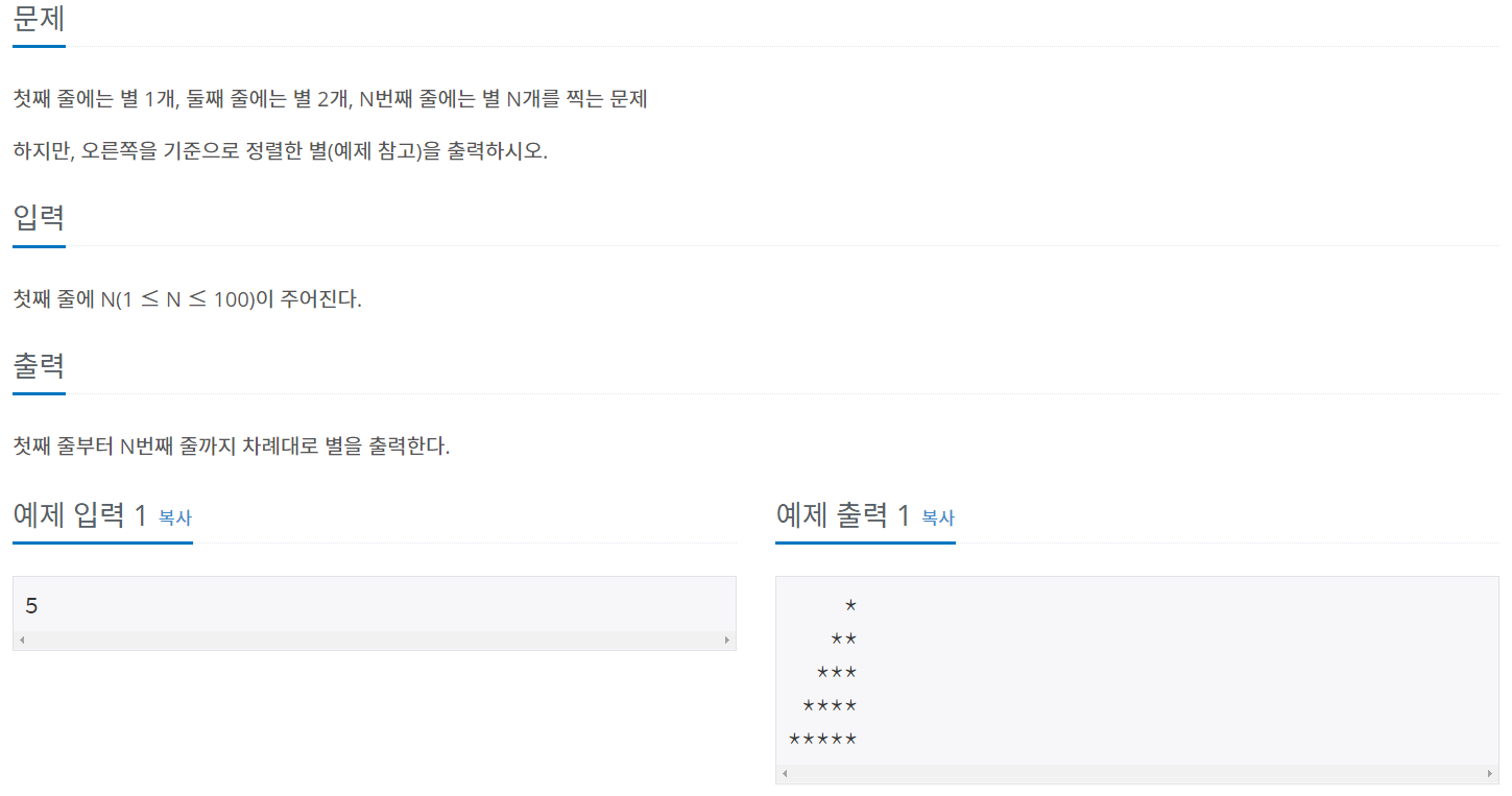 백준 알고리즘의 for문 별 찍기 -2 ( 문제 번호 : 2439 )의 소스입니다.