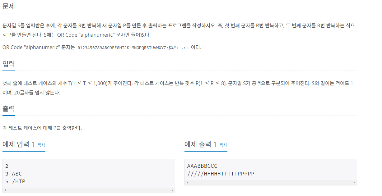 백준 알고리즘의 문자열 중 문자열 반복 ( 문제 번호 : 2675 )의 소스입니다.