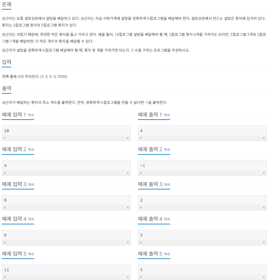 백준 알고리즘의 수학1 중 설탕 배달 ( 문제 번호 : 2839 )의 소스입니다.