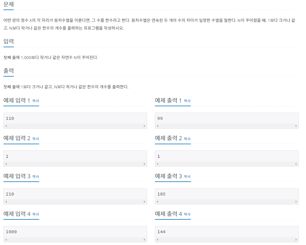 백준 알고리즘의 함수 중 한수 ( 문제 번호 : 1065 )의 소스입니다.